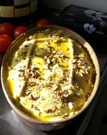 salt og peber - skiftevis smørklatter og olie mellem lagene. Der kan