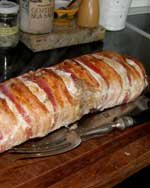 hinanden på baconstykkerne, saltes let. Farsen lægge som en pølse på