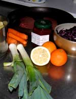 rødvin, buquet garni (fx persille, laurbær, timian, selleristilk)